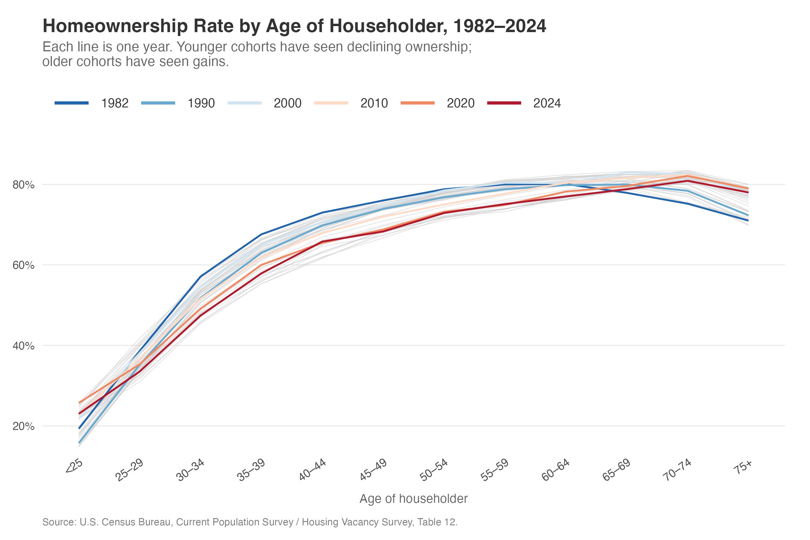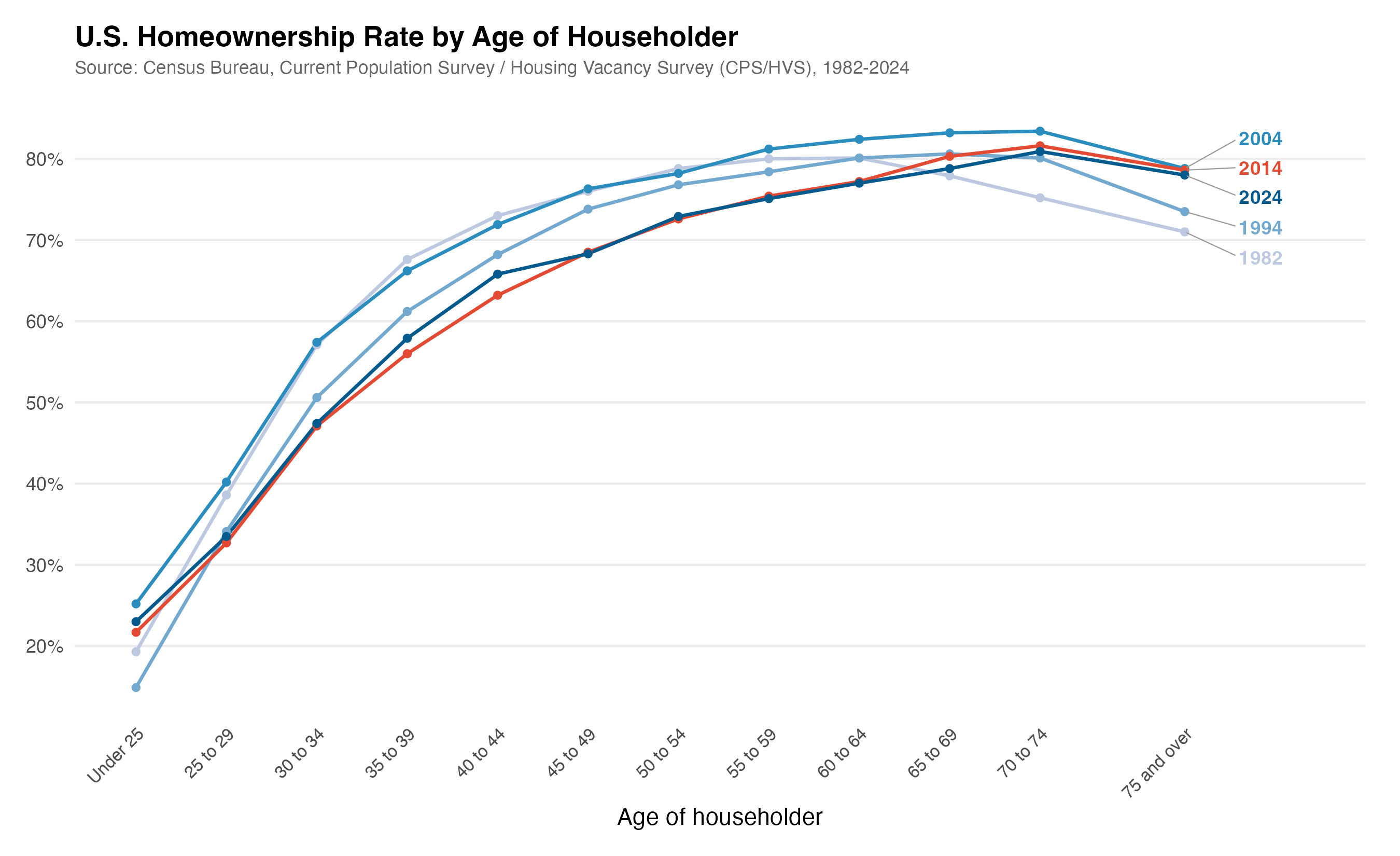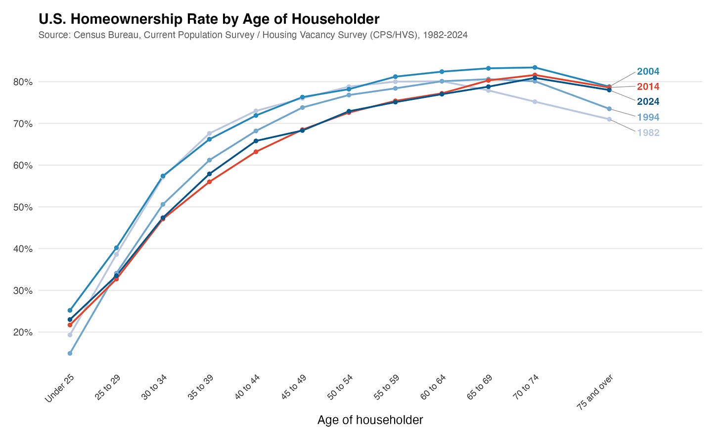 That earlier figure is what you’d expect from the Housing Vacancy Survey: homeownership rates rising with age, the distribution shifting rightward over time (older households gaining homeownership share, younger ones losing it), and a visible dip during the financial crisis that hit younger age groups much harder than older ones. The 2004 peak is clear, and you can see that the crisis years look very similar to where we are now in 2024.
